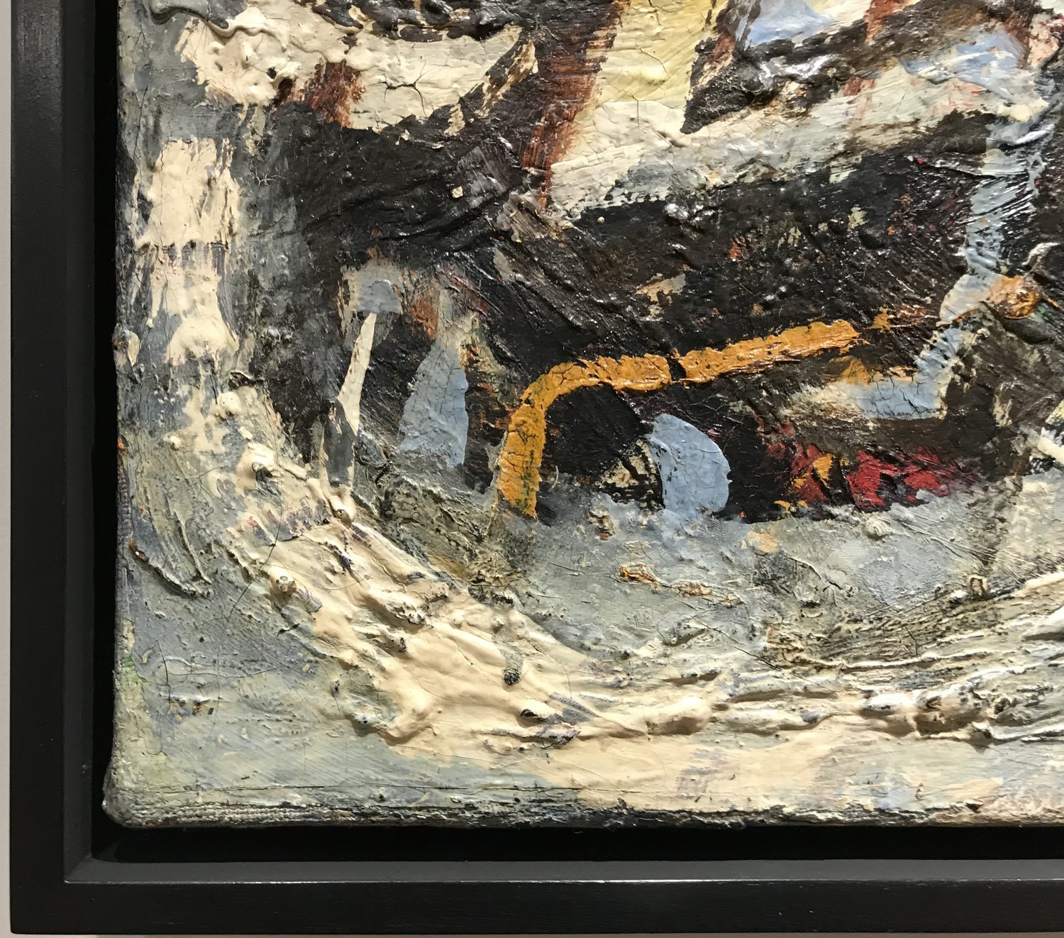 Composition With Masked Forms, 1941, oil on canvas, 28-1/8 x 50 in., custom float frame, ebonized walnut exterior and top edge, interior float space light-absorbing matte black. Custom frame fabricated by Gill & Lagodich for Colby Museum of Art. Gift of the Barsalona Family, Museum purchase from the Jere Abbott Acquisition Fund, and gift of Peter and Paula Lunder, The Lunder Collection.